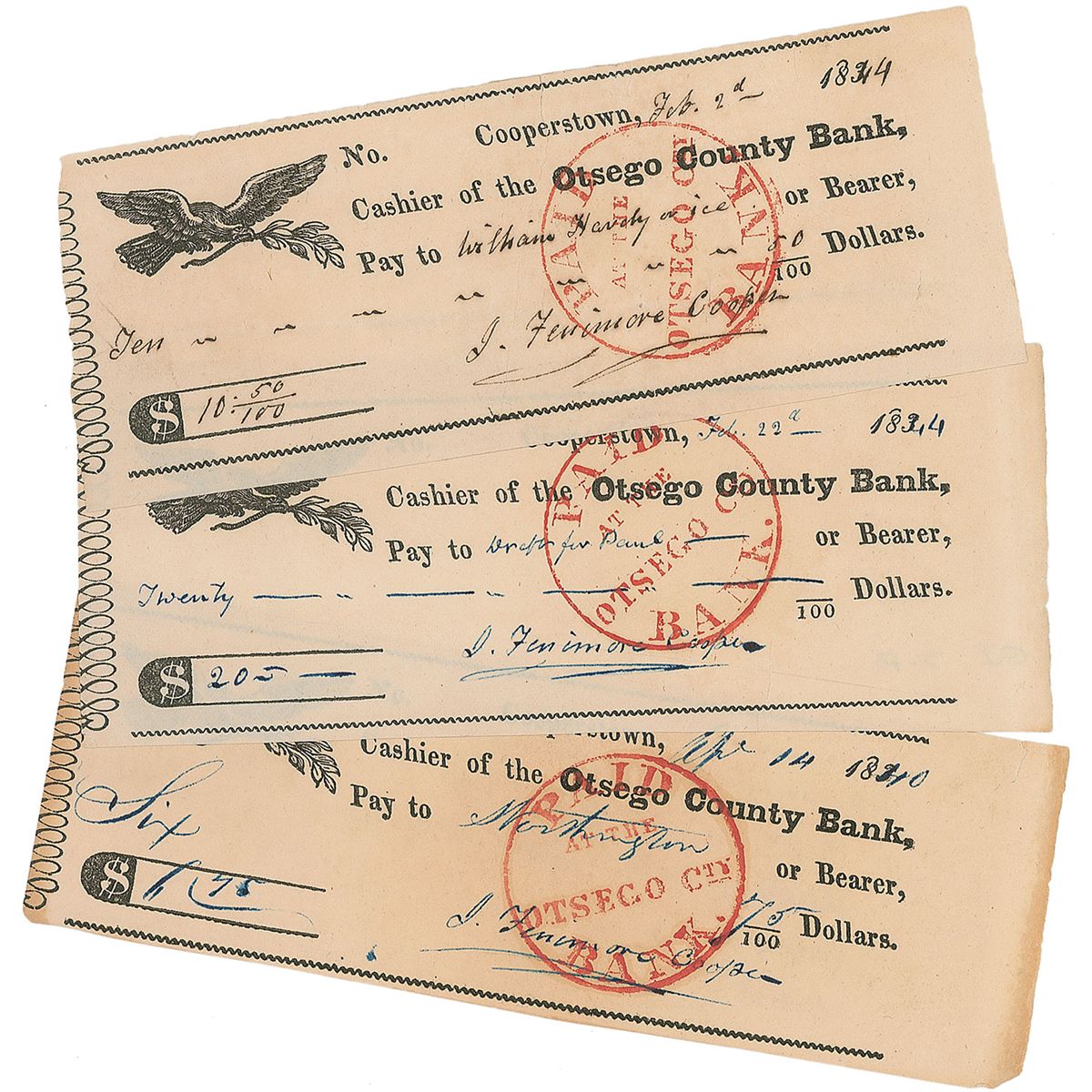 Three Otsego County Bank checks, all filled out and signed by Cooper, “J. Fenimore Cooper,” all dated 1834. In very good condition, with irregular edges, expected bank stamps affecting portions of the signature, small scattered tears along edges, and one check torn down the center but very neatly repaired with archival tape on reverse.