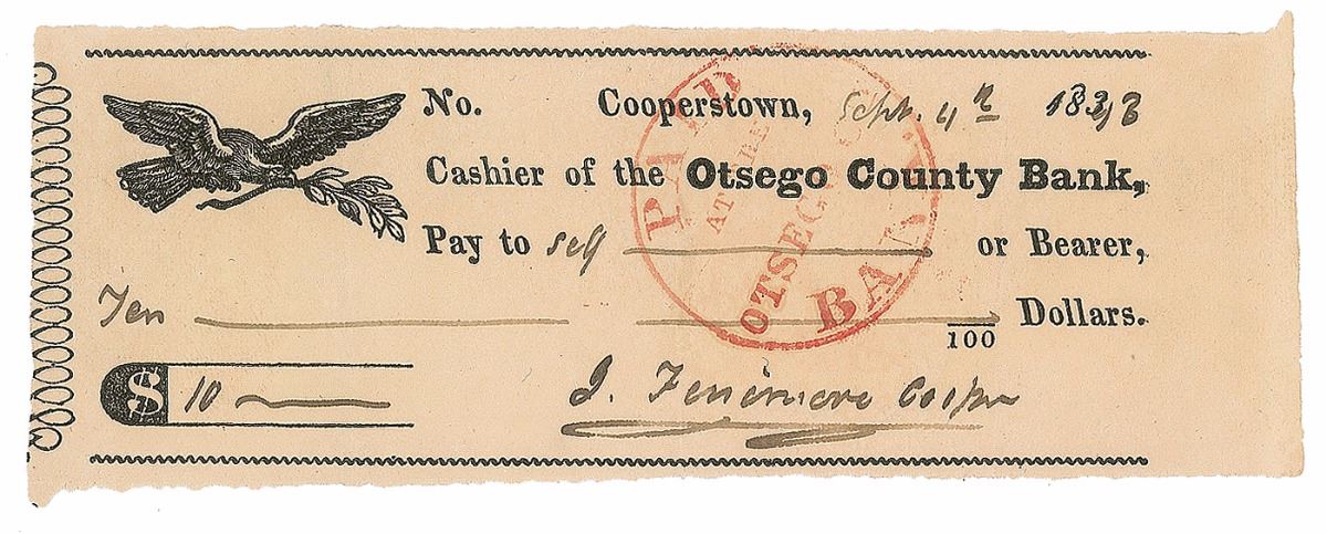 Otsego County Bank check, 6 x 2, filled out and signed by Cooper, “J. Fenimore Cooper,” payable to Self for $10, September 4, 1843. In fine condition.