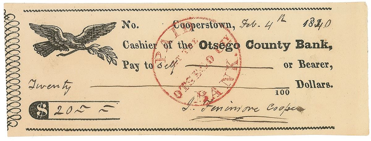 Fabulous handwritten manuscript, unsigned, one page both sides, 9.5 x 14.25, no date but circa 1832–1833. A page from Cooper’s manuscript for The Headsman, or the Abbaye of Vigneron. The present manuscript, which covers the content found from pages 159 to 166 of the 1833 Paris edition, and contains a conversation between the future baroness Adelheid de Willading and the commoner Sigismund Steinbach. Encapsulated in a Mylar sleeve. Also includes an Otsego County Bank check, 5.75 x 2, filled out and signed by Cooper, “J. Fenimore Cooper,” payable to self for $20, February 4, 1840. The manuscript bears heavy overall staining and soiling, several large repaired tears, and repaired paper loss to a few small areas, otherwise very good condition; the check is in fine condition, with expected bank stamps touching the first two letters of the signature.