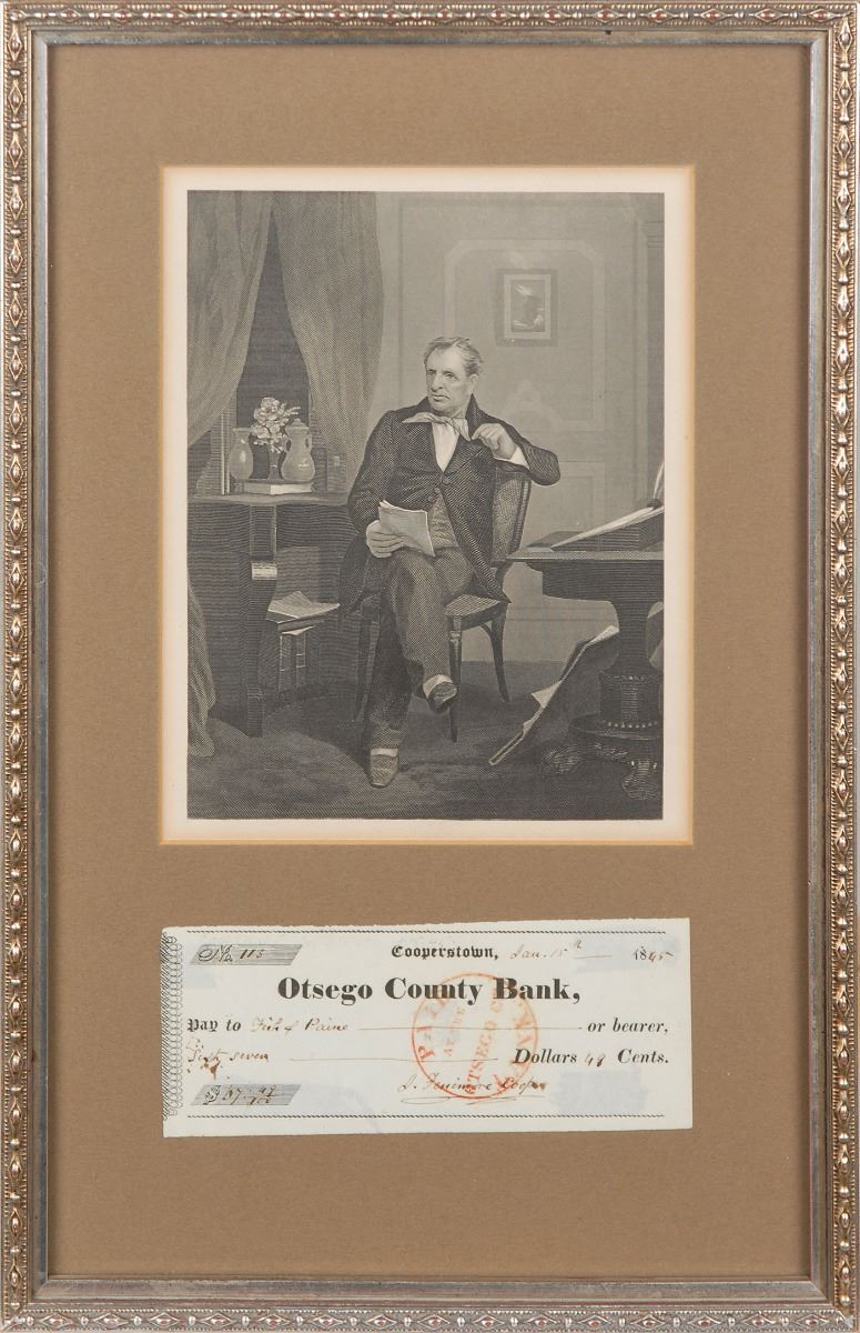 Otsego County Bank check, 6 x 2.5, filled out and signed by Cooper, “J. Fenimore Cooper,” payable to Fitch & Paine for $67.49, January 15, 1845. Mounted and framed with an engraving of the author to an overall size of 9.75 x 15.25. In very good to fine condition, with mounting remnants on the reverse showing through near each corner.