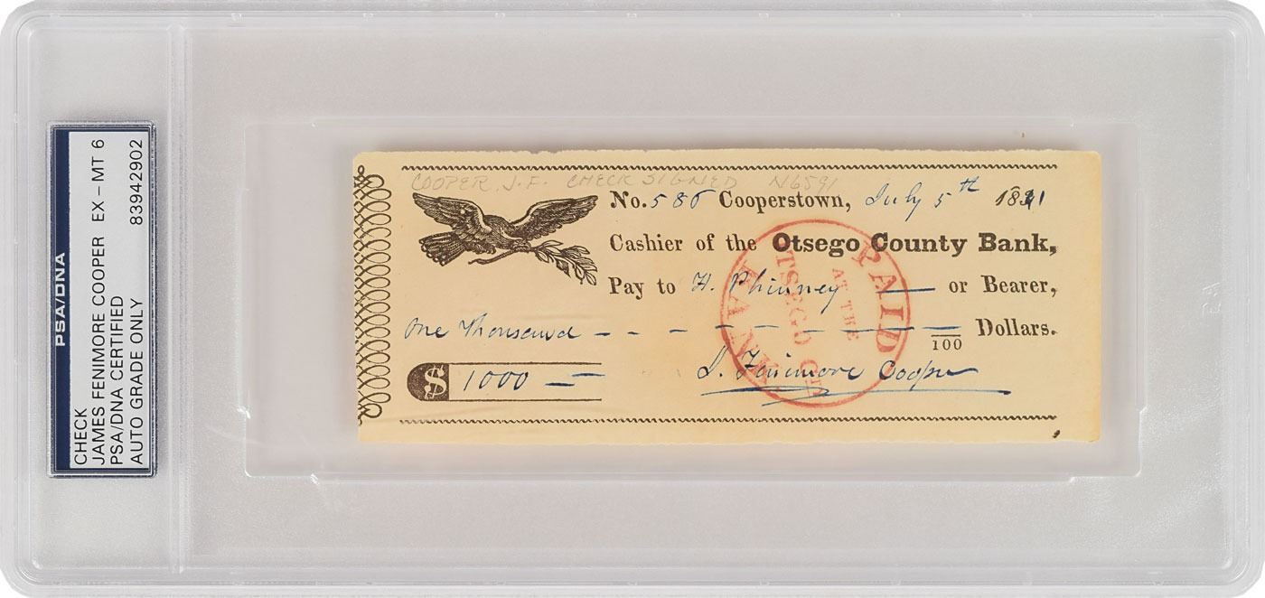 Otsego County Bank check, 5.75 x 2.25, filled out and signed by Cooper, "J. Fenimore Cooper," payable to H. Phinney for $1000, July 5, 1841. Encapsulated in a plastic PSA/DNA authentication and grading holder, evaluating the autograph as "EX-MT 6." In fine condition.