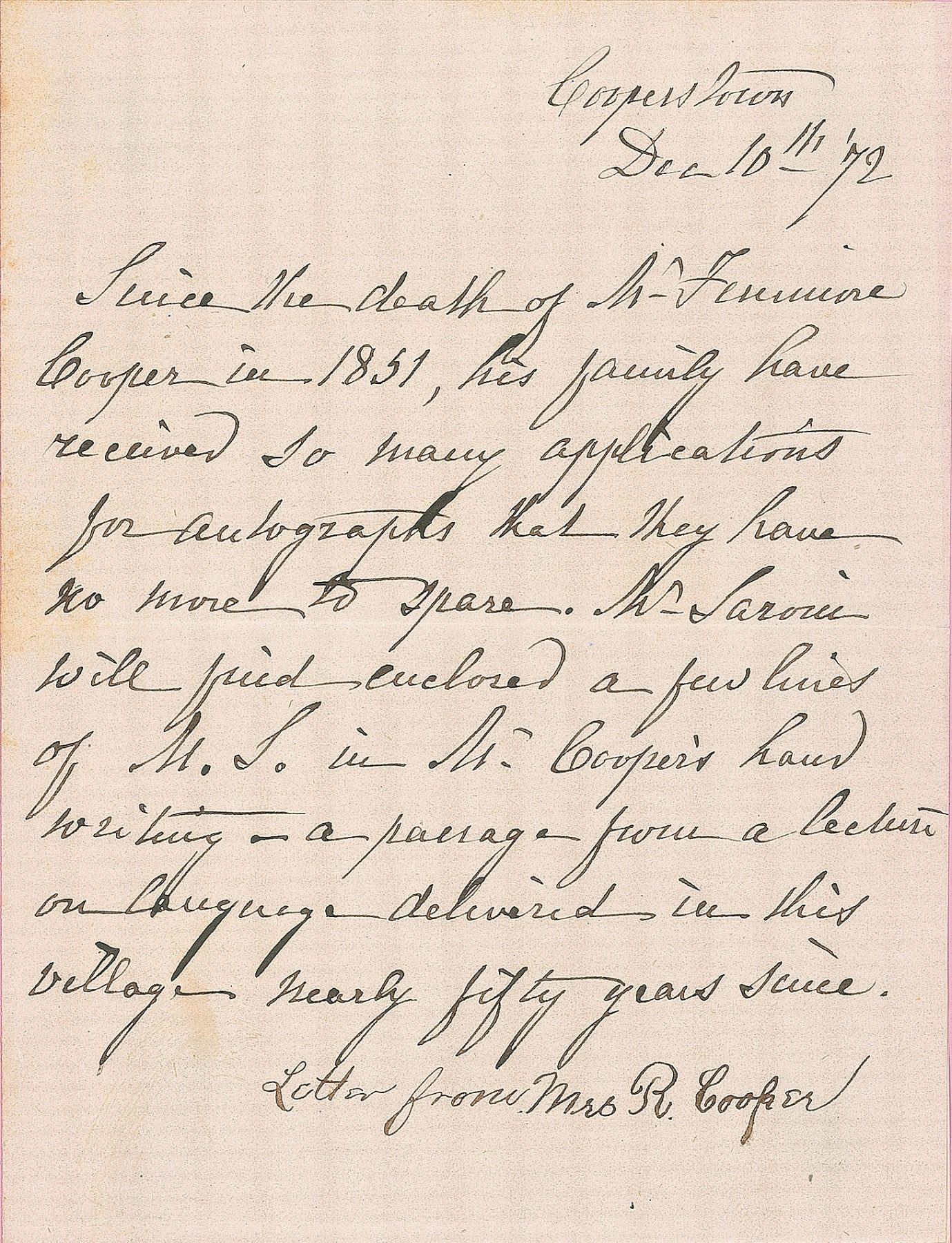 Handwritten manuscript fragment by James Fenimore Cooper, one page, 7.75 x 1.75, headed "On Language." In full: "Language, the fit attendant of reason, distinguishes man from all the other creatures of the earth. The faculty of speech is one of the highest gifts of nature, and it is important in proportion as learning, all truths, and the charities of life are of interest to human happiness." Includes a letter from Mrs. R. Cooper, dated December 10, 1879, transmitting "a few lines of M.S. in Mr. Cooper's hand writing—a passage from a lecture on language delivered in this village nearly fifty years since." In very good to fine condition, with two tears to the fragment.