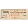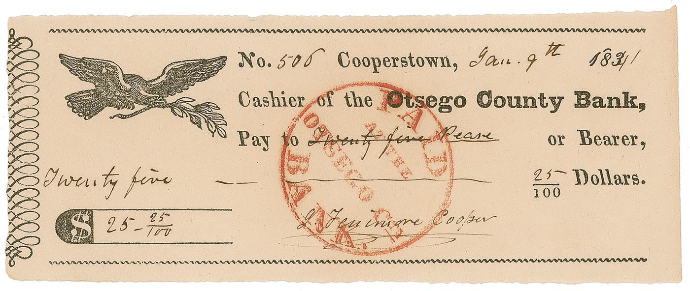 Bank check, 5.75 x 2.25, filled out and signed by Cooper, “J. Fenimore Cooper,” payable to Pease for $25.00, January 9, 1834. In fine condition, with small tear touching the paraph under the signature and a bank stamp atop his name.