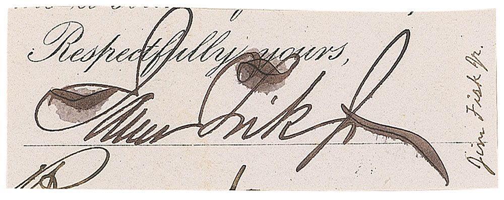 Colorful American financier (1834–1872) who made his fortune on army contracts during the Civil War. He was shot and killed after becoming involved in a scandalous romantic triangle. Ink signature, “James Fisk, Jr.,” on an off-white 2.5 x 1 slip affixed to a slightly larger card. In fine condition, with moderate spreading to portions of ink in signature.