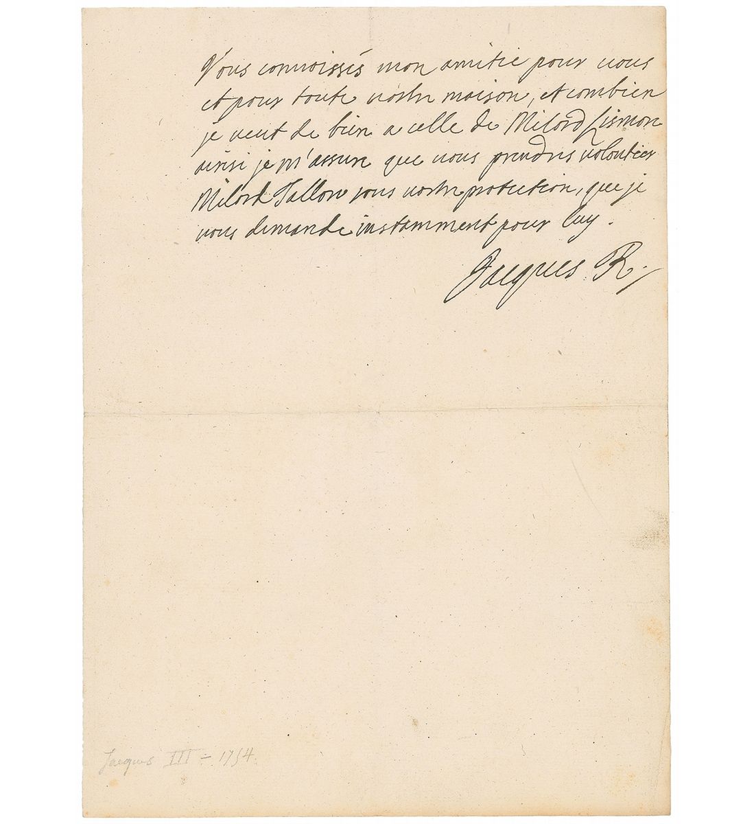 Son of King James II of England who claimed the English, Scottish and Irish thrones (as James III of England and Ireland and James VIII of Scotland) from the death of his father in 1701. ALS in French, signed “Jacques R,” one page, 7.5 x 10.75, no date. Untranslated letter to a nobleman mentioning Lord Linsmore and Lord Tallow among his supporters. Central horizontal and vertical folds, some light soiling and wrinkling, and pencil notation along bottom edge, otherwise fine condition.