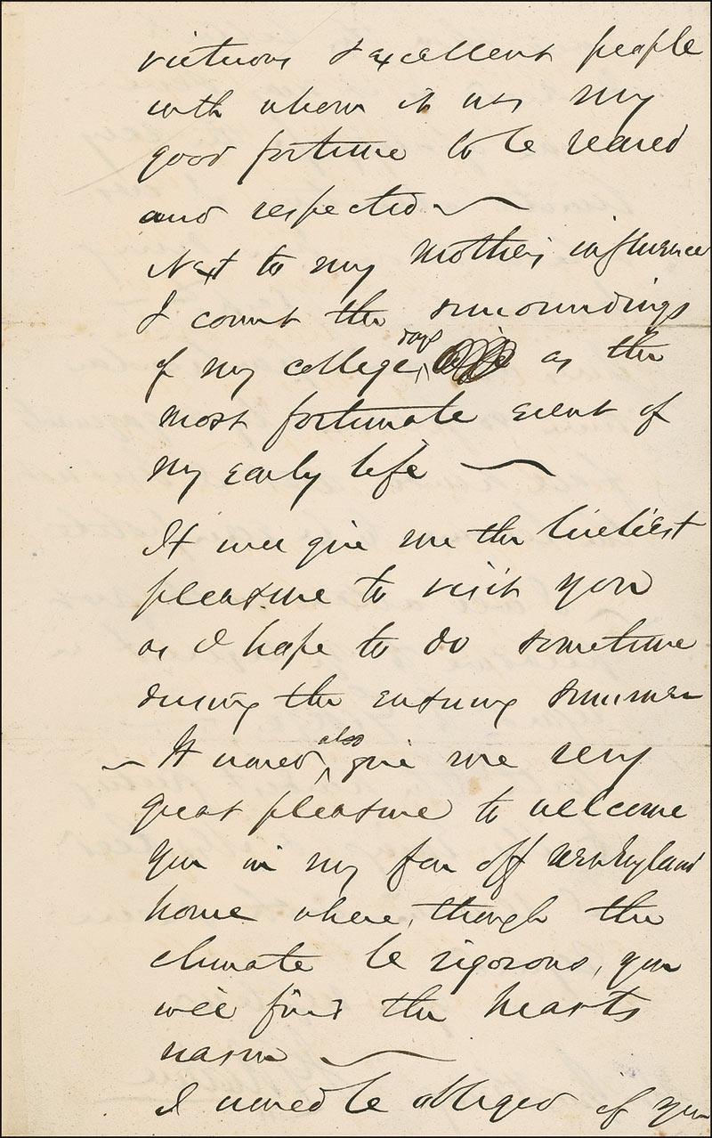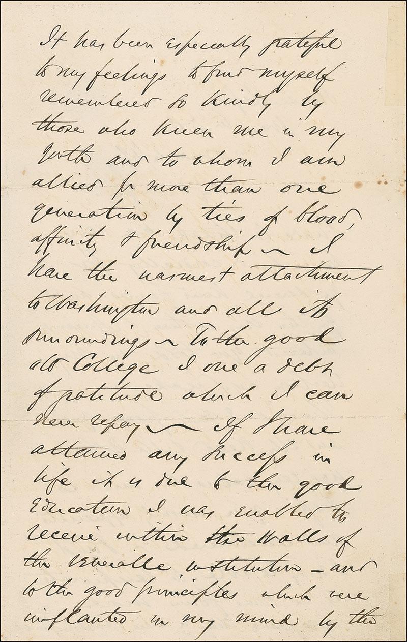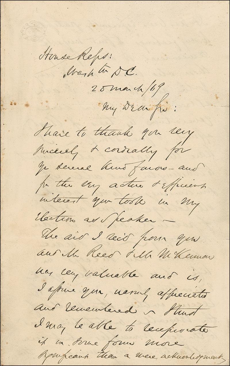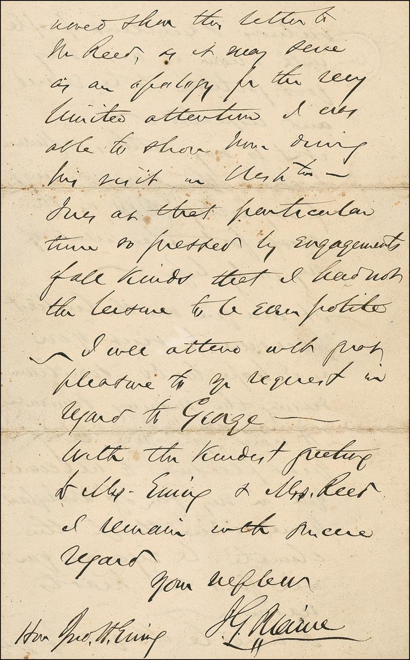Politician nicknamed the “Plumed Knight,” he became secretary of state in 1889. ALS signed “J. G. Blaine,” four pages on two adjoining sheets, 5 x 8, May 20, 1869. Letter to George Ewing. In part: “It has been especially grateful to my feelings to find myself remembered so kindly by those who knew me in my youth…I have the warmest attachment to Washington [College] and all of its surroundings. To the good old College I owe a debt of gratitude which I can never repay. If I have attained any success in life it is owed to the good education I was enabled to receive within the walls of the venerable institution, and to the good principles which were implanted in my mind by the virtuous & excellent people with whom it was my good fortune to be reared and respected.” In fine condition, with some scattered light toning and soiling. Pre-certified PSA/DNA and RRAuction COA.