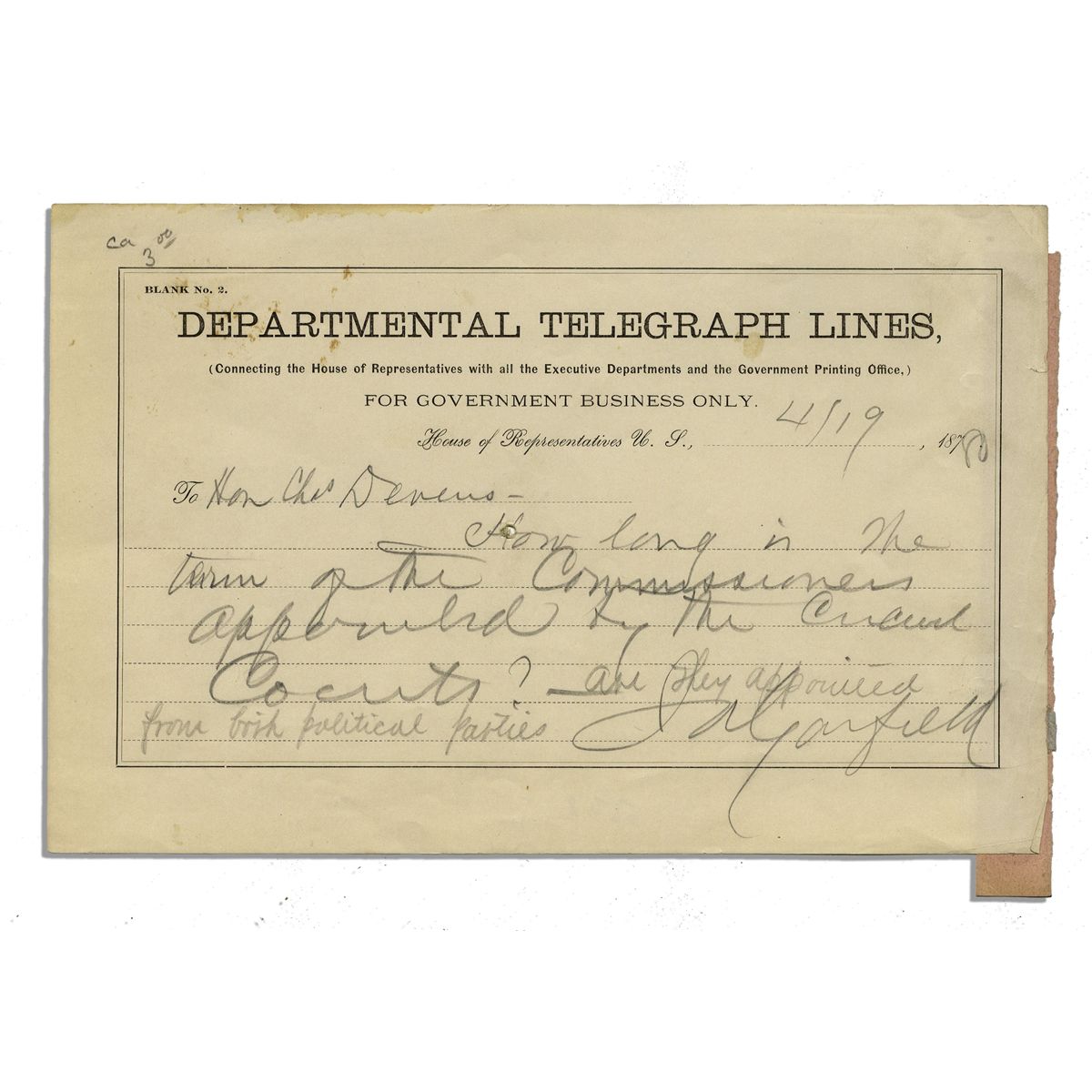 James Garfield telegram signed, ''J.A. Garfield'' during his ninth and final term in the House of Representatives before taking presidential office. Partially-printed telegram is dated 19 April 1880 and filled in with pencil, possibly by Garfield. Addressed to Charles Devins of the U.S. House of Representatives, telegram inquires as to the length of term of ''commissioners appointed by the Council''. Measures 9'' x 5.75''. Toning and minor pencil notations, with a tiny tear to center, else near fine.