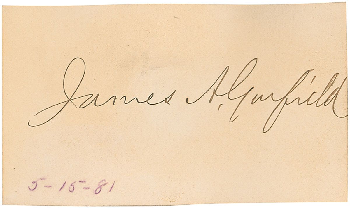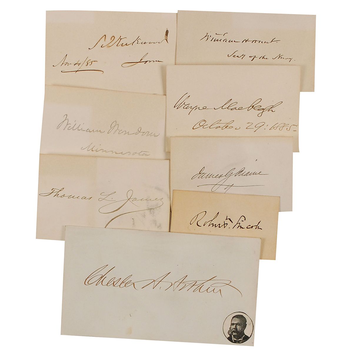 Rare full ink signature, “James A. Garfield,” on an off-white 3.5 x 2 card. Contemporary date notation to the lower left of May 15, 1881, makes this likely signed as president. Mild overall toning, light rippling, and mounting remnants to reverse, otherwise fine condition. Accompanied by eight cards, each signed by a member of his cabinet. Signers are: Chester A. Arthur, Robert Todd Lincoln, James G. Blaine, William Windom, Samuel J. Kirkwood, Wayne MacVeagh, William H. Hunt, and Thomas Lemuel James. Various scattered toning, soiling, and light rippling, otherwise overall fine condition.