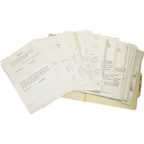 <B>James Garner "Tonight Show" Dossier from Johnny Carson's Secretary.</B></I> Compiled and maintained by Johnny Carson's secretary, Shirley Wood, this was one of many files featuring introductions and potential questions <I>Tonight Show</B></I> guests' appearances on the show. This particular file was for James Garner, and features question lists and notecards with printed intros from approximately two dozen appearances dating from 1967-86. The documents are in overall Very Fine condition with mild wear.<BR><BR><b>Shipping:</b> Books & Catalogs (<a target="_blank" href="http://www.heritageauctions.com/common/shipping.php">view shipping information</a>)