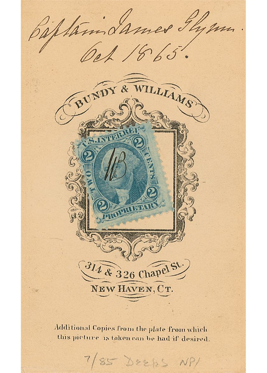 US Navy officer who was the first American to negotiate with Japan during its ‘closed country’ period and later commanded the sloop Macedonian. Original 2.5 x 4 carte-de-visite photo of Glynn in uniform by Bundy and Williams of New Haven, signed on the reverse in black ink, “Captain James Glynn, Oct 1865.” In fine condition, with a pencil notation and revenue stamp affixed to reverse.