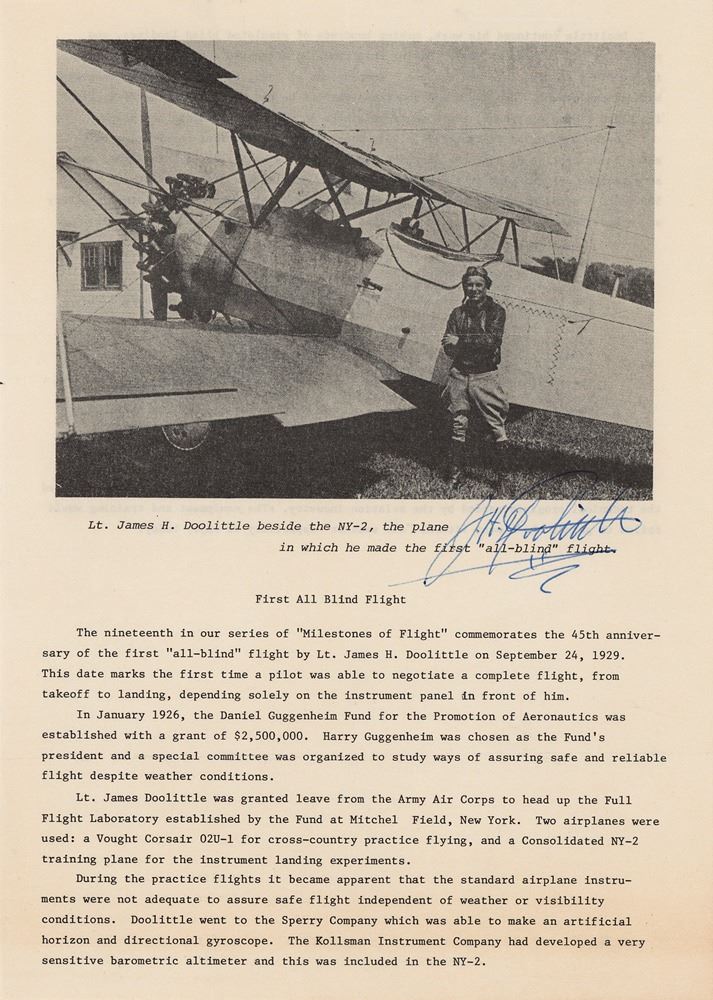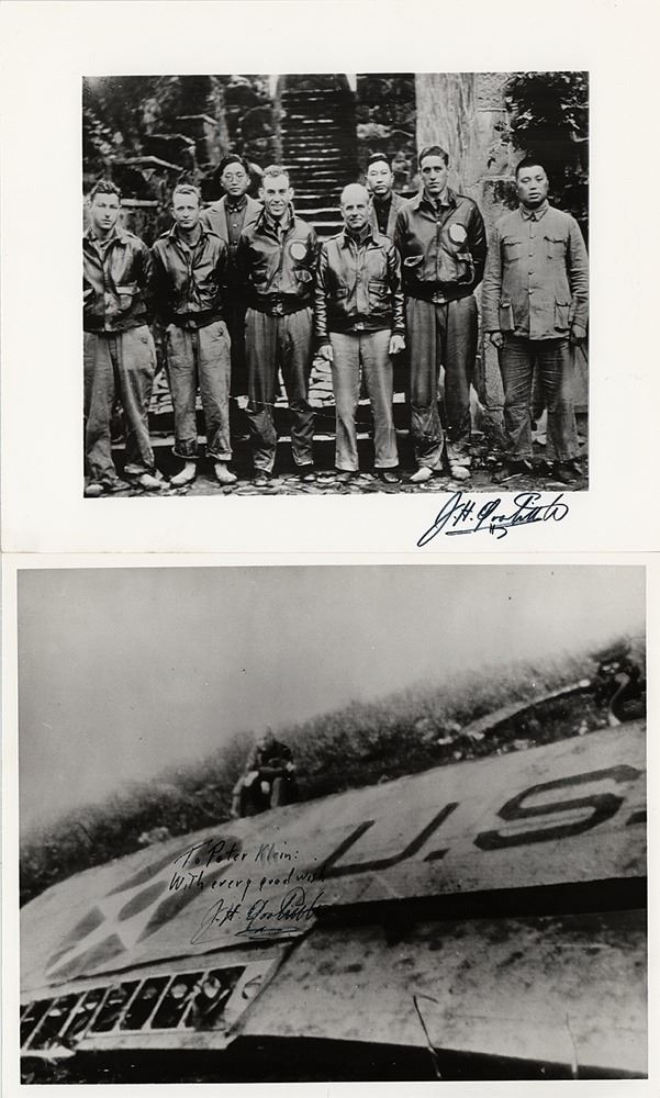 Three items: a glossy 10 x 8 photo of Doolittle with his Tokyo bombing crew, signed in black felt tip, "J. H. Doolittle"; a glossy 10 x 8 photo of Doolittle sitting on the wing of his crashed plane, signed and inscribed in black felt tip, "To Peter Klein: With every good wish, J. H. Doolittle"; and a 6 x 8.5 page honoring his pioneering 'first blind flight,' signed in blue ballpoint, "J. H. Doolittle." In very good to fine condition, with creasing to the upper left corners of the two photos, and some irregular ink adhesion to the inscribed photo.