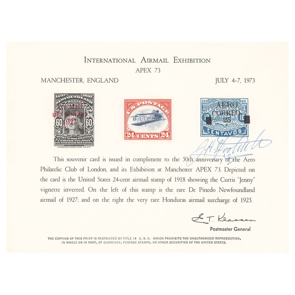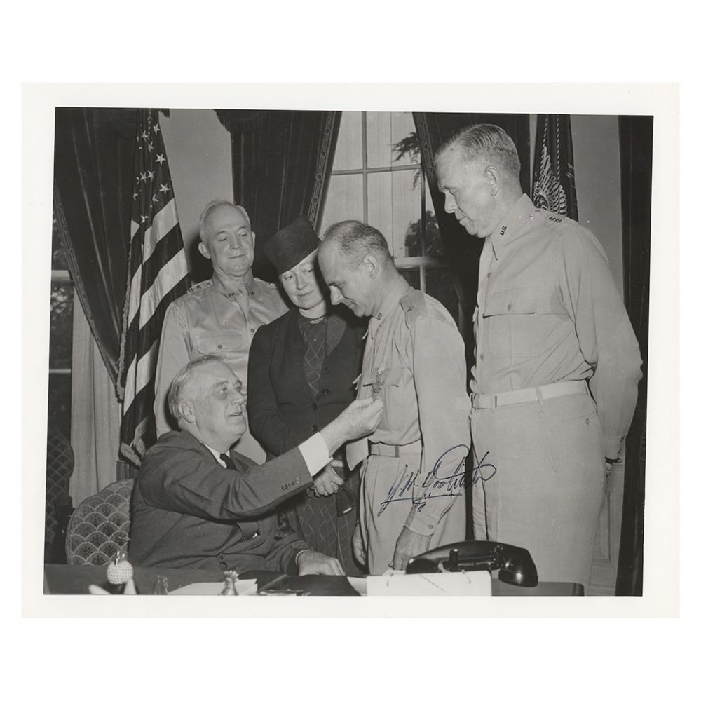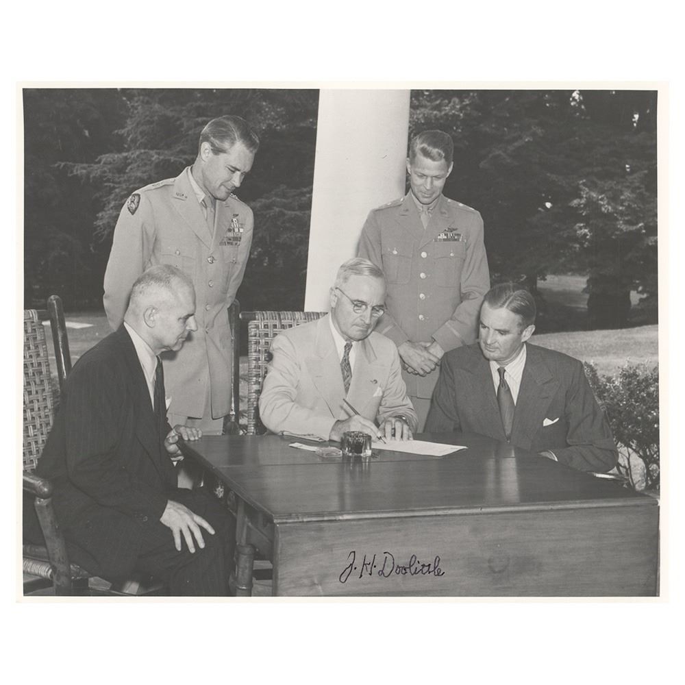Four items signed by Dootittle, including: an International Airmail Exhibition souvenir card, signed in blue ballpoint; a glossy 8 x 10 portrait, signed and inscribed in blue felt tip; a glossy 10 x 8 photo of him meeting President Franklin D. Roosevelt, signed in black felt tip; and a matte-finish 10 x 8 photo of him meeting with President Harry S. Truman, signed in black felt tip. In overall fine condition.