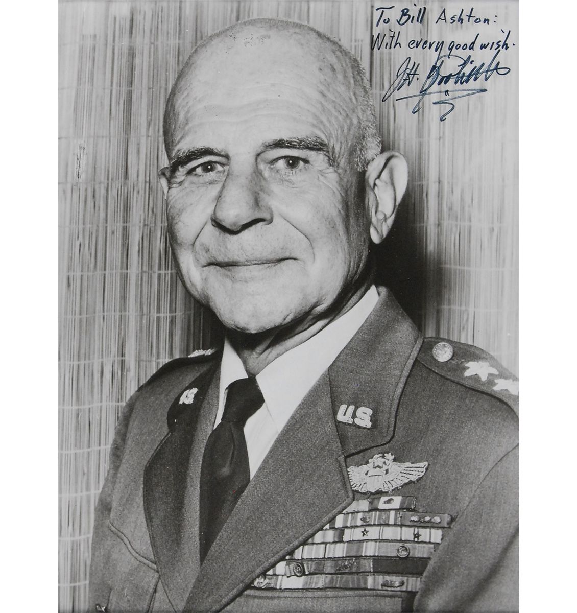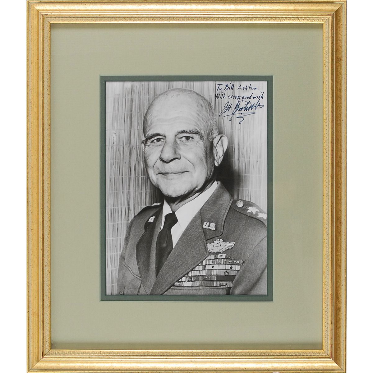 Matte-finish 6.75 x 9 photo of the aviator in uniform, signed and inscribed in black felt tip, “To Bill Ashton: With every good wish, J. H. Doolittle.” Double-matted and framed to an overall size of 13.5 x 16. In fine condition, with a surface wrinkle at his lapel.