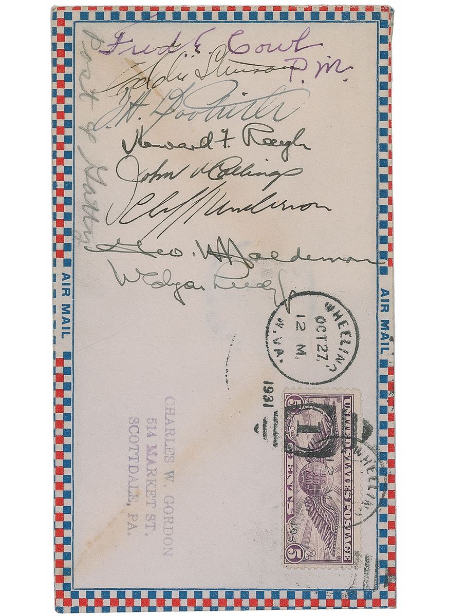 Airmail cover postmarked Wheeling, West Virginia, October 27, 1931, signed in fountain pen by James H. Doolittle, Postmaster Fred E. Cowl, aircraft manufacturer Edward Stinson, Lieutenant Howard F. Rough, John Collings, George W. Haldeman, and two others. A pencil notation also notes that Post and Gatty were there. Light bands of toning from envelope adhesive, otherwise fine condition.