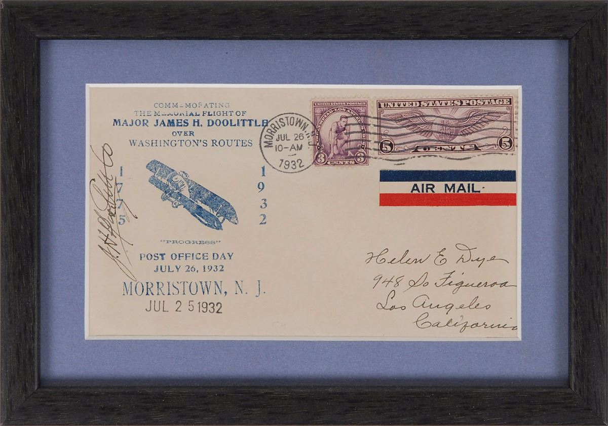 Commemorative cover with a cachet honoring Doolittle’s memorial flight over Washington’s routes on July 26, 1932, signed vertically in fountain pen along the left edge, “J. H. Doolittle.” Framed and in fine condition, with an address written in the lower right corner and a mild shade of uniform toning.