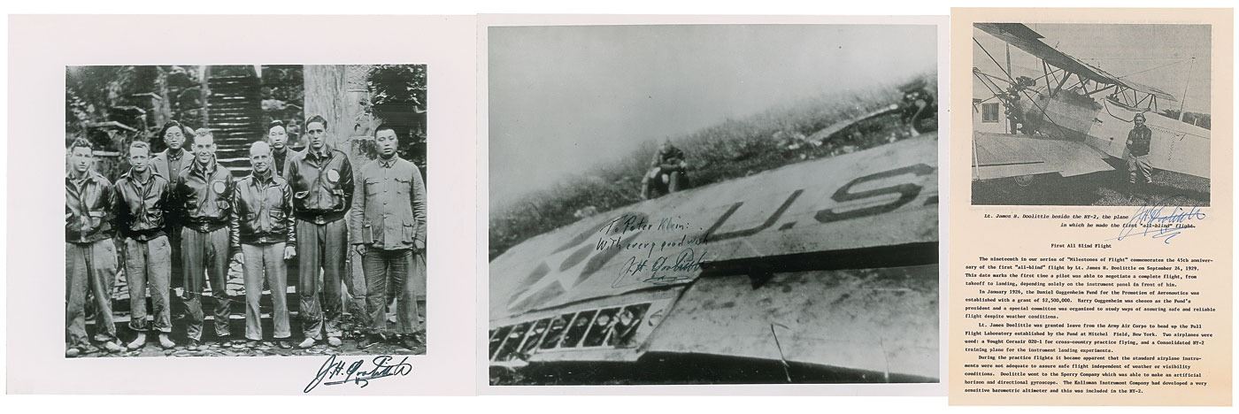 Three items: a glossy 10 x 8 photo of Doolittle with his Tokyo bombing crew, signed in black felt tip, "J. H. Doolittle"; a glossy 10 x 8 photo of Doolittle sitting on the wing of his crashed plane, signed and inscribed in black felt tip, "To Peter Klein: With every good wish, J. H. Doolittle"; and a 6 x 8.5 page honoring his pioneering 'first blind flight,' signed in blue ballpoint, "J. H. Doolittle." In very good to fine condition, with creasing to the upper left corners of the two photos, and some irregular ink adhesion to the inscribed photo.
