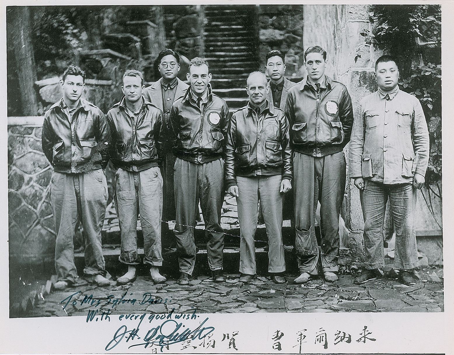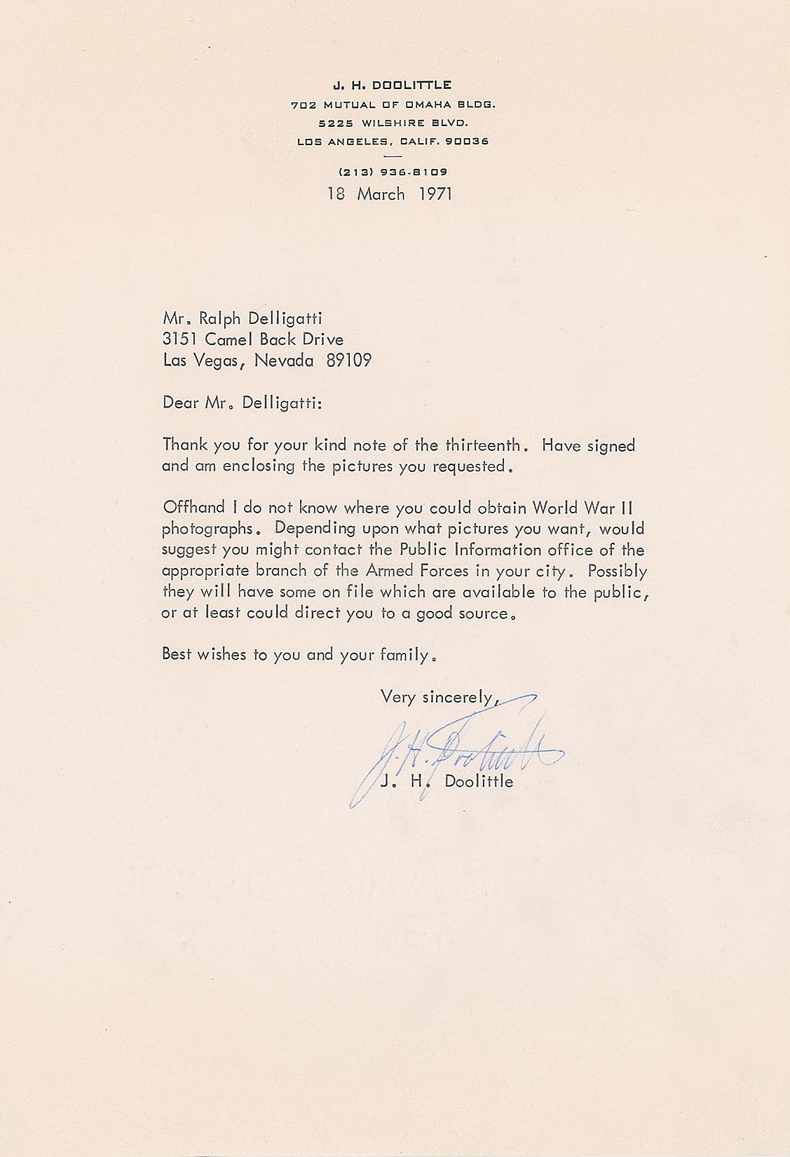 Two items: a glossy 10 x 7.75 photo of Lieutenant Colonel James H. Doolittle with members of his flight crew and Chinese officials in China after the April 18, 1942 attack on Japan, signed and inscribed in black felt tip, "To Mrs. Sylvia Davis: with every good wish, J. H. Doolittle"; and a TLS, one page, 7.25 x 10.5, personal letterhead, March 18, 1971, addressed to Ralph Delligatti, in part: "Offhand I do not know where you could obtain World War II photographs. Depending upon what pictures you want, would suggest you might contact the Public Information office of the appropriate branch of the Armed Forces in your city." In overall fine condition.