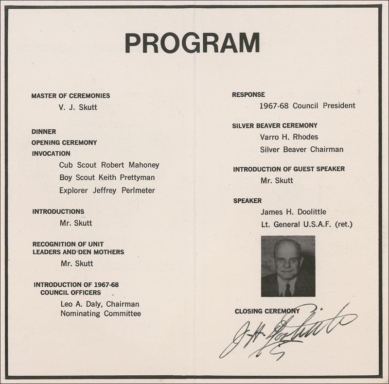 Program, 3.5 x 7, two pages, for the Boy Scouts of America Mid-America Council Annual Recognition Dinner, signed inside under his image in black ink. In fine condition, with small pencil notation to front cover. RRAuction COA.