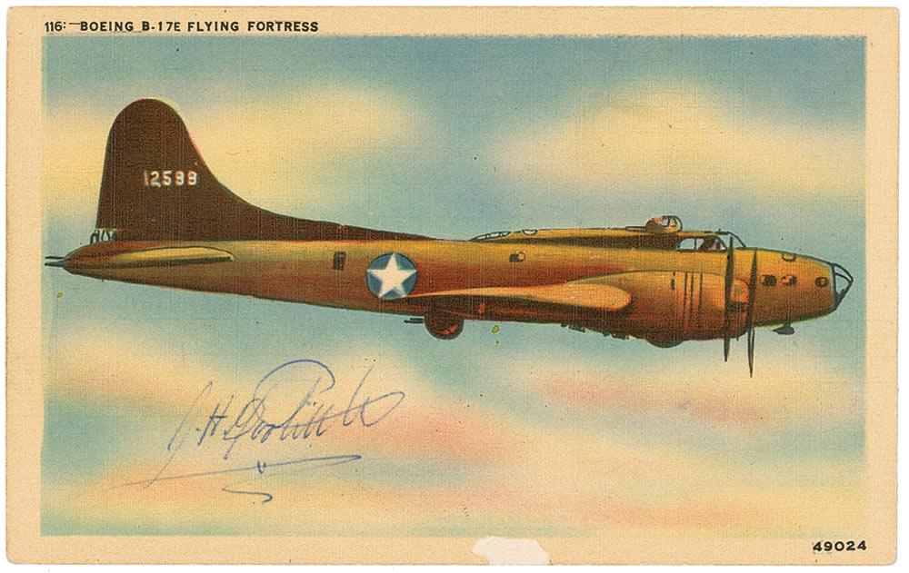 Color vintage 5.5 x 3.5 postcard photo of a Boeing B-17 Flying Fortress, signed in blue ballpoint, “J. H. Doolittle.” In fine condition, with a small area of surface loss to bottom border. RRAuction COA.