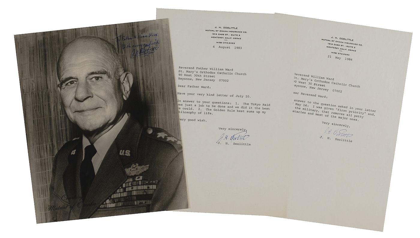 Three items: two TLSs, one page each, 7.25 x 10.5, Mutual of Omaha Insurance Company letterhead. The first letter, August 4, 1983, reads in part: “In answer to your questions: 1. The Tokyo Raid was just a job to be done and we did it the best we could. 2. The Golden Rule best sums up my philosophy of life.” The second letter, May 21, 1984, reads in part: “I was given ‘first priority’ and, in the military, that removes all petty obstacles and most of the major ones.” Each signed in blue ballpoint, “J. H. Doolittle”; and an 8 x 10 matte-finish photo signed and inscribed in blue felt tip, “To Father William Ward: With every good wish. J. H. Doolittle.” In overall fine condition.