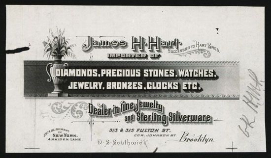 New York, ND (ca.1880's), ÒJames H. HartÓ importer and dealer in fine jewelry on Fulton St. in Brooklyn, NY, Engraved trade card, calling card or letterhead on india paper with penciled ÒOKÓ note in the margin, Couple of pinholes top right and a small piece out of the left side do not detract, Fine condition, ABNC.