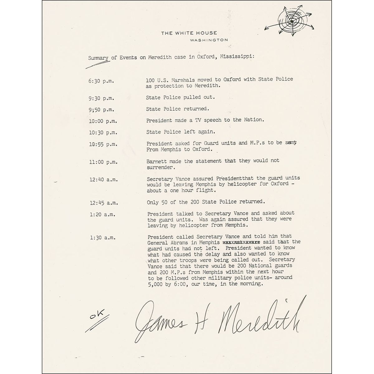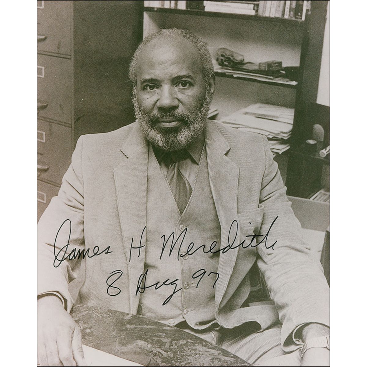 Civil rights icon (born 1933) who gained worldwide attention in 1962 when, after a public political struggle between JFK and segreationist Governor Ross Barnett, he became the first black student admitted to the University of Mississippi. Two items: Copy souvenir typescript, 11 pages, 8.5 x 11, September 30, 1962, White House letterhead. Document detailing the “Summary of Events on Meredith case in Oxford, Mississippi,” with a small ink sketch in the top right corner of the first page; and a satin-finish 8 x 10 photo of Meredith at his desk, signed in black felt tip, “James H. Meredith, 8 Aug 97.” In fine condition.