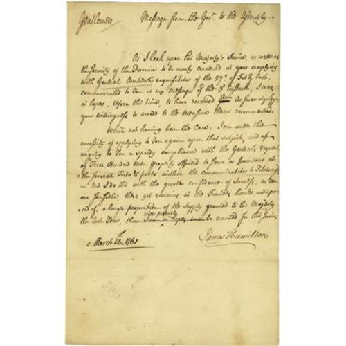 <B>James Hamilton Letter Signed as Lt. Governor of Pennsylvania,</B></I> one page, 7.75" x 12.5", Philadelphia, Pennsylvania, March 12, 1761, "<I>to the Assembly</B></I>". As Lt. Governor of Pennsylvania, Hamilton (ca. 1710-1783) here writes in part: "<I>As I look upon His Majesty's Service, as well as the security of the Province to be nearly concern'd in your complying with General Amherst's requisition…I was in hopes, before this time, to have received an answer signifying your willingness to accede to the measure therein recommended. Which not having been the case: I am under the necessity of…urging to you a speedy compliance with the General's request of 'Three Hundred Men properly officer'd to serve as Garrisons at the several Forts & posts within the communication to Pittsburgh'…</B></I>". Mild toning as expected, very fine condition. <I>Ex. Henry E. Luhrs Collection.</B></I><BR><BR><b>Shipping:</b> Flat Material, Small (<a target="_blank" href="http://www.heritageauctions.com/common/shipping.php">view shipping information</a>)