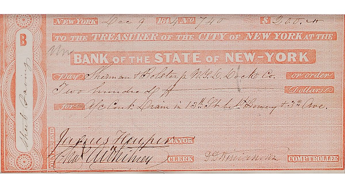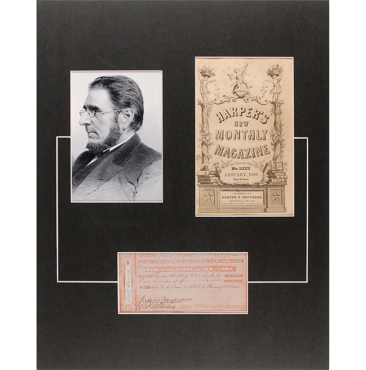 Former mayor of New York and publisher of Harper’s Weekly (1795–1869). Bank check, 6.75 x 3.25, filled out in another hand and signed by Harper as mayor of New York, payable to Sherman & Bolster N.Y.C. Dock Co. for $200.00, December 9, 1844. Matted with a portrait of Harper and the cover of a January 1857 issue of Harper’s New Monthly Magazine to an overall size of 16 x 20. In fine condition, with a couple small ink marks and notations.