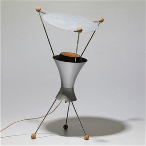Crate worked as an Industrial Stylist at General Motors. The three legs of this innovative lamp slide in their mount to adjust the angle of the light reflector. The lamp received third prize at the Museum of Modern Art Low Cost lighting competition in 1951.