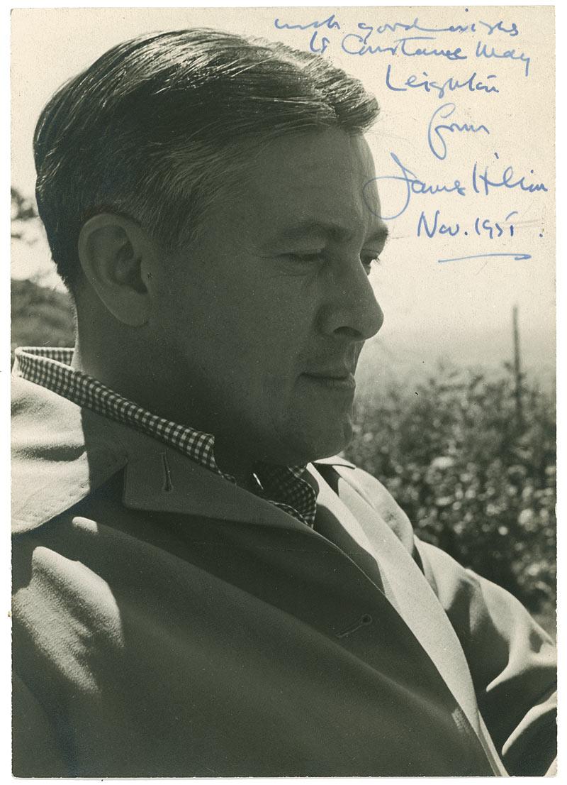 Oscar-winning English novelist (1900-1954) whose works include Lost Horizon and Goodbye Mr. Chips. Vintage matte-finish 4.75 x 6.75 portrait of Hilton in a relaxed pose, signed and inscribed in blue fountain pen “With good wishes to Christine May Leighton from James Hilton, Nov. 1951.” In fine condition, with light silvering to some of the darker areas of the image. RRAuction COA.