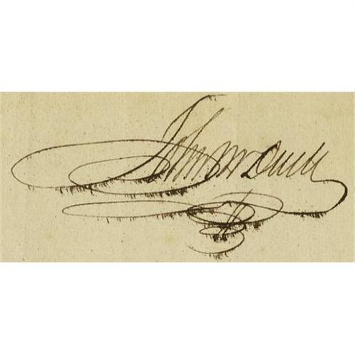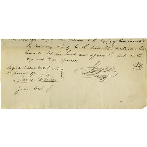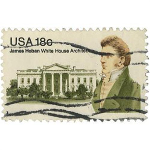 <B>James Hoban Document Signed</B></I> "<I>James Hoban.</B></I>" Partial handwritten document, measuring 8" x 4". The document is of a legal nature and is signed by two other men in addition to Hoban. Accompanying the document are three smaller items relating to Hoban. One is a photograph of a piece of artwork depicting Hoban, another is a stamp featuring Hoban and his masterpiece, the White House, and there is a small newspaper clipping about Hoban. It reads, "<I>On the morning of March 14th, 1792, citizens across the country opened their broadsides and gazettes to a unique advertisement.</B></I>" Penned by Secretary of State Thomas Jefferson, it announced a competition for the design of George Washington's presidential residence. "<I>Commissioners of Federal Buildings in Washington, in the Territory of Columbia,</B></I>" would award $500 or a medal of that value to the person who "<I>shall produce to them the most approved plan…for a President's House to be created in this City.</B></I>" The entry by Washington's favorite, Irish carpenter-builder James Hoban, won hands down. Hoban took the medal. Hoban is responsible for one of America's greatest symbols, and yet his name is nearly forgotten. Commemorate the architect of the White House by bidding on this lot! <BR><BR>The partial document is in fine condition; the document has begun to yellow from age and acid degradation; localized foxing on the edges; usual folds are present; small tears along folds; signatures and handwriting are dark and crisp!