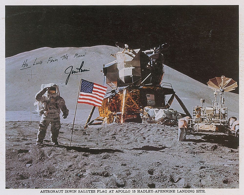 Color 10 x 8 NASA photo of Irwin saluting the flag on the lunar surface, signed in black felt tip beneath a pre-printed sentiment. In fine condition.