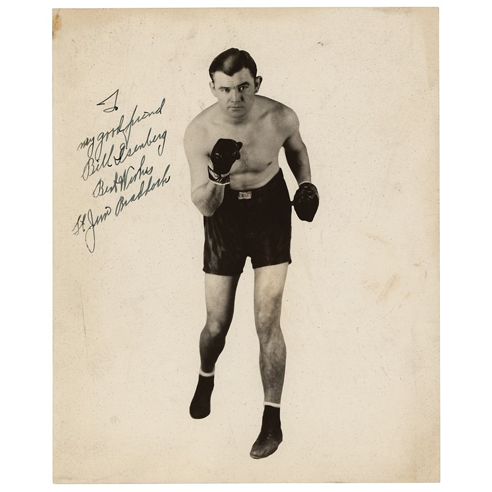 American boxer (1905-1974) who was heavyweight champion of the world from 1935 to 1937, and whose career was dramatized in the Oscar-nominated 2005 film Cinderella Man. Vintage glossy 8 x 10 full-length photo of Braddock in a fantastic pugilistic pose, signed and inscribed in fountain pen, "To my good friend Bill Isenberg, Best Wishes, Lt. Jim Braddock.” In very good to fine condition, with scattered light creasing and soiling.