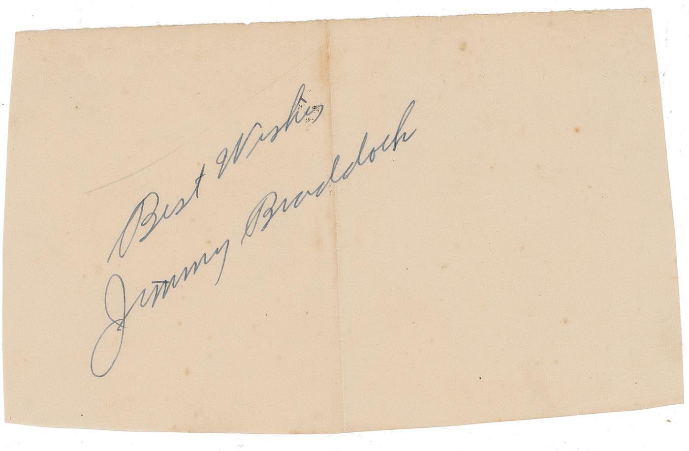 American boxer (1905–1974) who was heavyweight champion of the world from 1935 to 1937 and whose career was dramatized in the Oscar-nominated 2005 film, Cinderella Man. Vintage ink signature, “Best wishes, Jimmy Braddock,” on an off-white 6 x 3.75 trimmed slip. A central vertical fold, one through a single letter of signature, and some scattered light toning and soiling, otherwise fine condition.