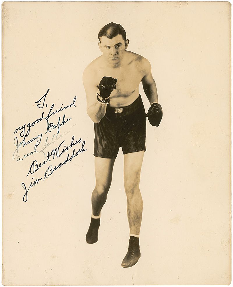 Vintage glossy 8 x 10 photo, signed and inscribed in fountain pen to middleweight boxer Johnny Papke, “To my good friend Johnny Papke, a real fellow, Best Wishes, Jim Braddock.” Scattered creases and surface marks, some light silvering to darker area (visible only at an angle), small tear to top edge, and one line of inscription light, but legible, otherwise fine condition.