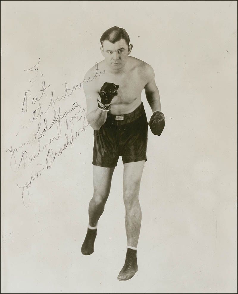 American Boxing Hall of Famer (1905–1974) who was heavyweight champion of the world from 1935 to 1937 and whose career was dramatized in the Oscar-nominated 2005 film, Cinderella Man. Vintage glossy 8 x 10 photo of Braddock striking a pugilistic pose, signed and inscribed in black ballpoint “To Pat, with best wishes, your old sparring partner 1927, Jim Braddock.” In very good condition, with light overall skipping and irregular ink adhesion to signature and inscription, scattered surface impressions, and a ding to left edge.
