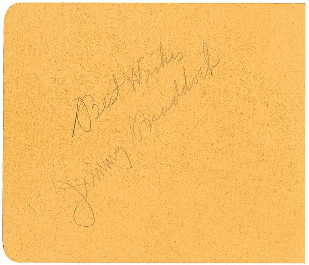 Vintage pencil signature, “Best wishes, Jimmy Braddock,” on a yellow 5.25 x 4.5 album page. Reverse bears an ink signature of actress Jean Muir. In fine condition.