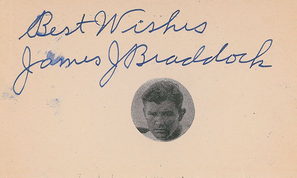 Vintage fountain pen signature, “Best wishes, James J. Braddock,” on an off-white 5 x 3 card bearing an affixed clipped magazine photo of the boxer. In fine condition, with some brushing to the start of the signature.