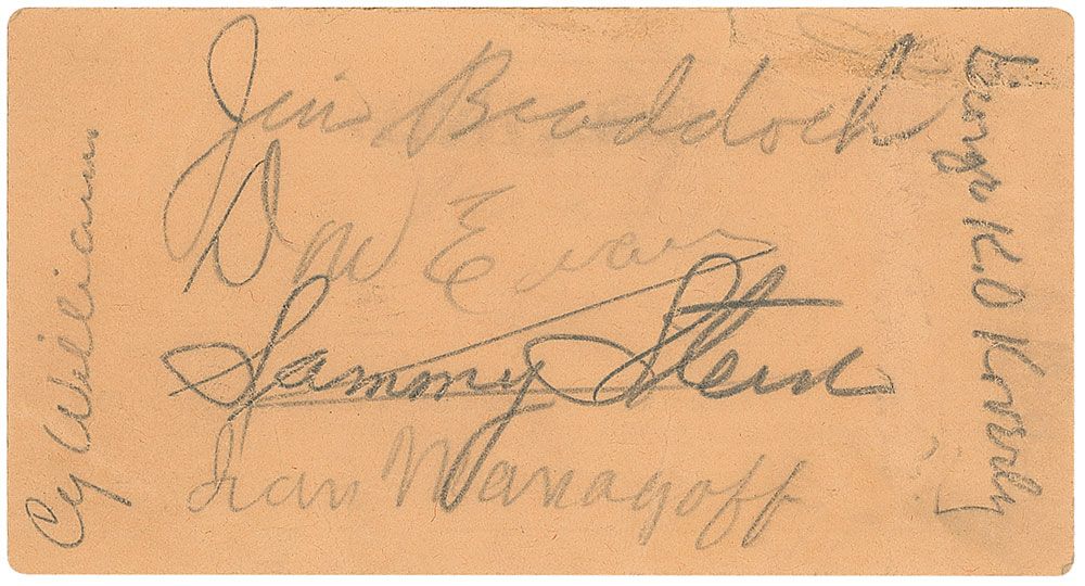 Complimentary ringside ticket for a boxing match at the Maple Grove Arena in Lancaster, PA, April 2, 1941, 4.5 x 2.5, signed on the reverse in pencil, “Jim Braddock.” Also signed by Cy Williams, George ‘K. O.’ Koverly, Don Evans, Sammy Stein, and one other. Moderate scattered creases (affecting last letter of Braddock’s signature), and a tiny tear to top edge, otherwise fine condition.