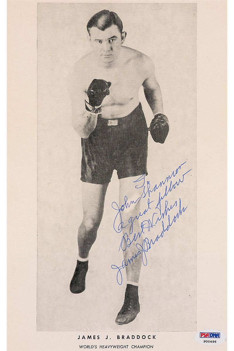 Uncommon 6.75 x 10.75 magazine photo of Braddock in a pugilistic pose, signed and inscribed in blue ballpoint, “To John Shannon, a great fellow, Best Wishes, James J. Braddock.” Affixed to an off-white 8.5 x 10.5 sheet. In fine condition, with trimmed edges and a PSA/DNA label affixed to the lower right corner. Accompanied by a full letter of authenticity from PSA/DNA.