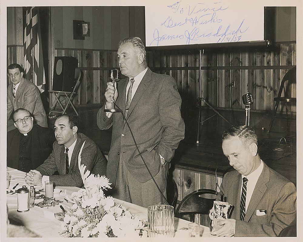 Vintage glossy 10 x 8 photo of Braddock speaking at the Annual Boxing Writers Dinner in Newark, signed and inscribed in blue ballpoint, “To Vince, Best Wishes, James J. Braddock.” Dated January 31, 1959, below the signature. Moderate skipping to ink, otherwise fine condition.