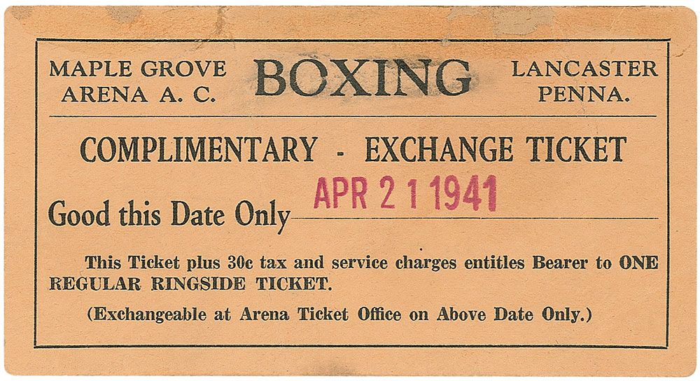 Complimentary ringside ticket for a boxing match at the Maple Grove Arena in Lancaster, PA, April 2, 1941, 4.5 x 2.5, signed on the reverse in pencil, “Jim Braddock.” Also signed by Cy Williams, George ‘K. O.’ Koverly, Don Evans, Sammy Stein, and one other. Moderate scattered creases (affecting last letter of Braddock’s signature), and a tiny tear to top edge, otherwise fine condition.