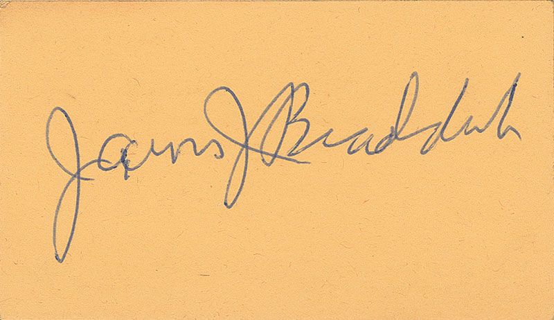 One of Braddock’s beige business cards for Braddock’s Corner restaurant in Newark, New Jersey, 3.5 x 2, signed on the reverse in blue ballpoint. In fine condition, with a bit of mild handling wear.