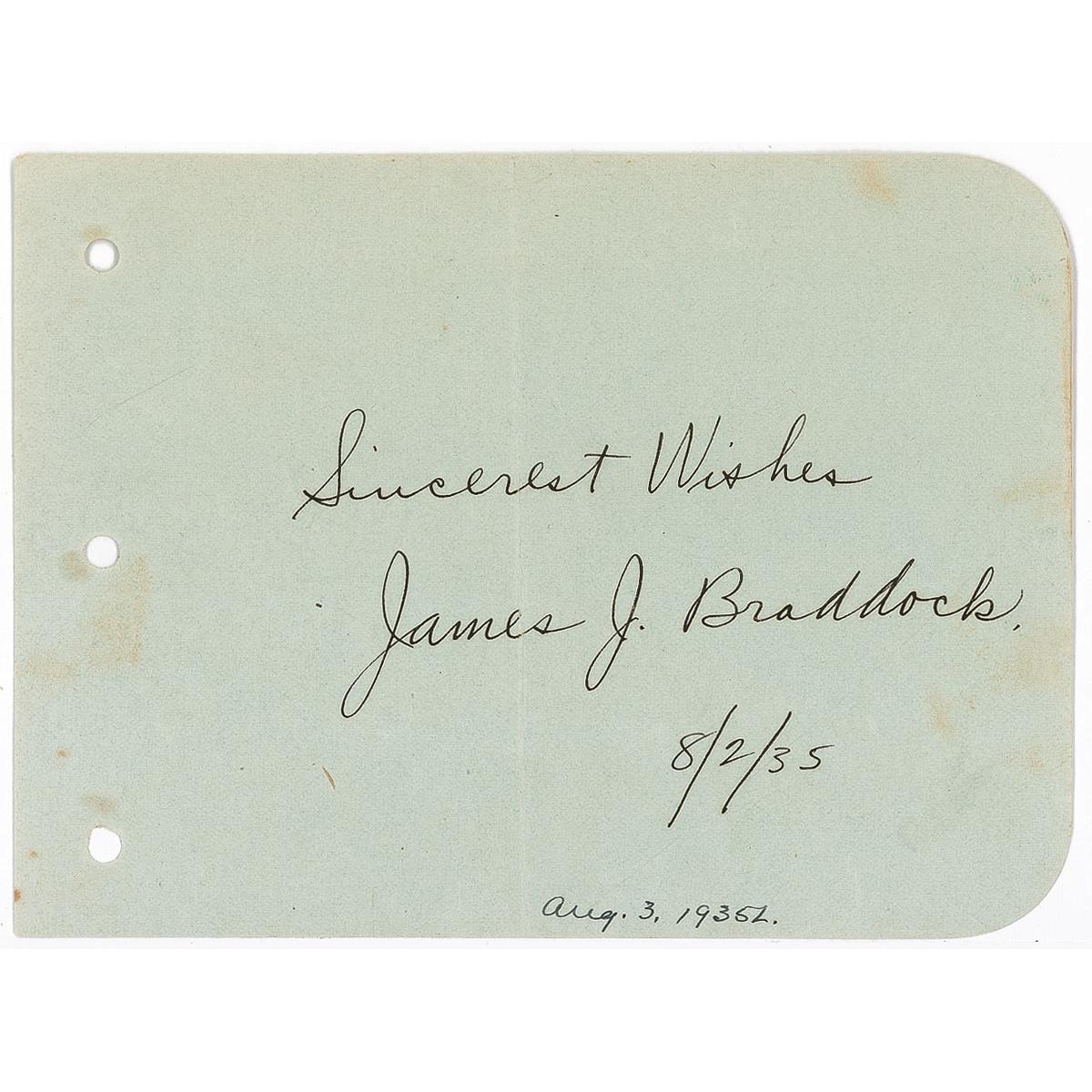 American boxer (1905–1974) who was heavyweight champion of the world from 1935 to 1937 and whose career was dramatized in the Oscar-nominated 2005 film, Cinderella Man. Vintage fountain pen signature, “Sincerest Wishes, James J. Braddock. 8/2/35,” on a green 6 x 4.5 album page. Vertical crease passing through his sentiment and signature, and scattered soiling with a few spots touching the end of his name, otherwise fine condition.