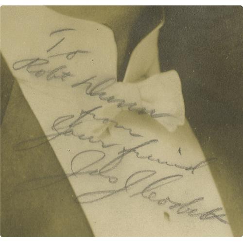 <B>Circa 1900 James J. Corbett Signed Studio Photograph.</B></I> Spectacular portrait of the man who ended the reign of bare knuckle legend John L. Sullivan aptly explains the nickname of "Gentleman Jim." The sepia image of Corbett in formal attire is inscribed in 9/10 ink "To Robt. Dunn from Your friend Jas. J. Corbett." The 7x9" photo has been chipped at opposing corners, with one just barely encroaching upon the image area. A proper matting and framing job will restore the piece to a NRMT appearance. <I>LOA from PSA/DNA.</B></I>