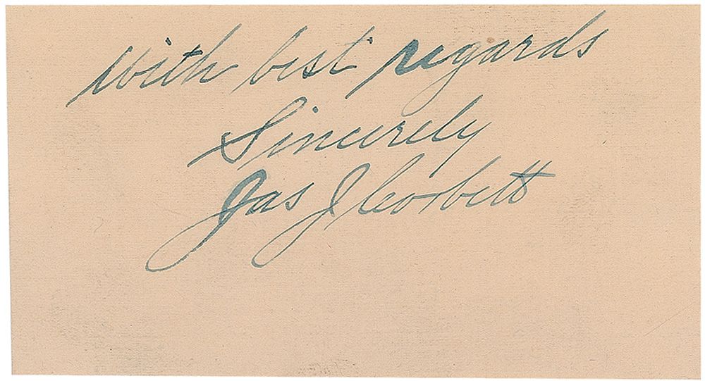 Vintage fountain pen signature, “With best regards, Sincerely, Jas. J. Corbett,” on an off-white 4.25 x 2.25 slip. In fine condition.
