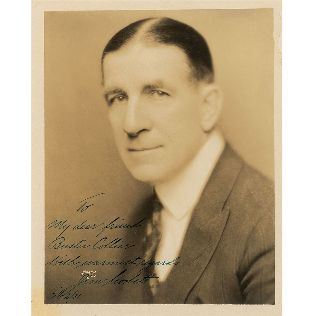 Choice vintage glossy 8 x 10 head-and-shoulders portrait of Corbett, signed and inscribed in fountain pen, “To my dear friend Buster Collier, with warmest regards, Jim Corbett, Feb. 2/31.” In fine condition, with trivial emulsion loss to the upper right border (not affecting the image). Accompanied by a full letter of authenticity from PSA/DNA. Provenance: William Collier Family Collection.