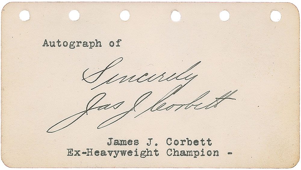 Crisp vintage fountain pen signature, “Sincerely, Jas. J. Corbett,” on an off-white 4.5 x 2.5 page. In fine condition.