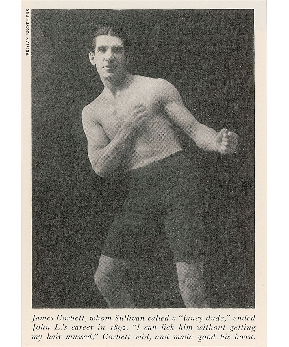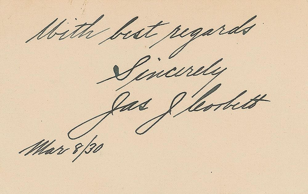Bold vintage ink signature, “With best regards, Sincerely, Jas. J. Corbett, Mar. 8/30,” on an off-white 5 x 3.25 card. In fine condition.