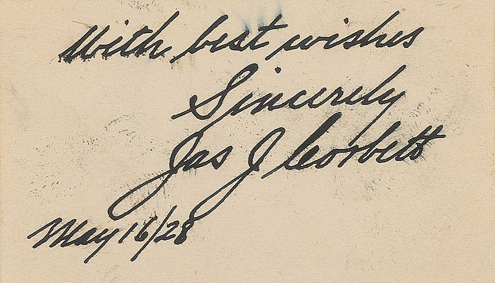 Extremely bold vintage ink signature, “With best wishes, Sincerely, Jas. J. Corbett, May 16/28,” on an off-white 3.5 x 2 card. Overall brushing to ink, otherwise fine condition.